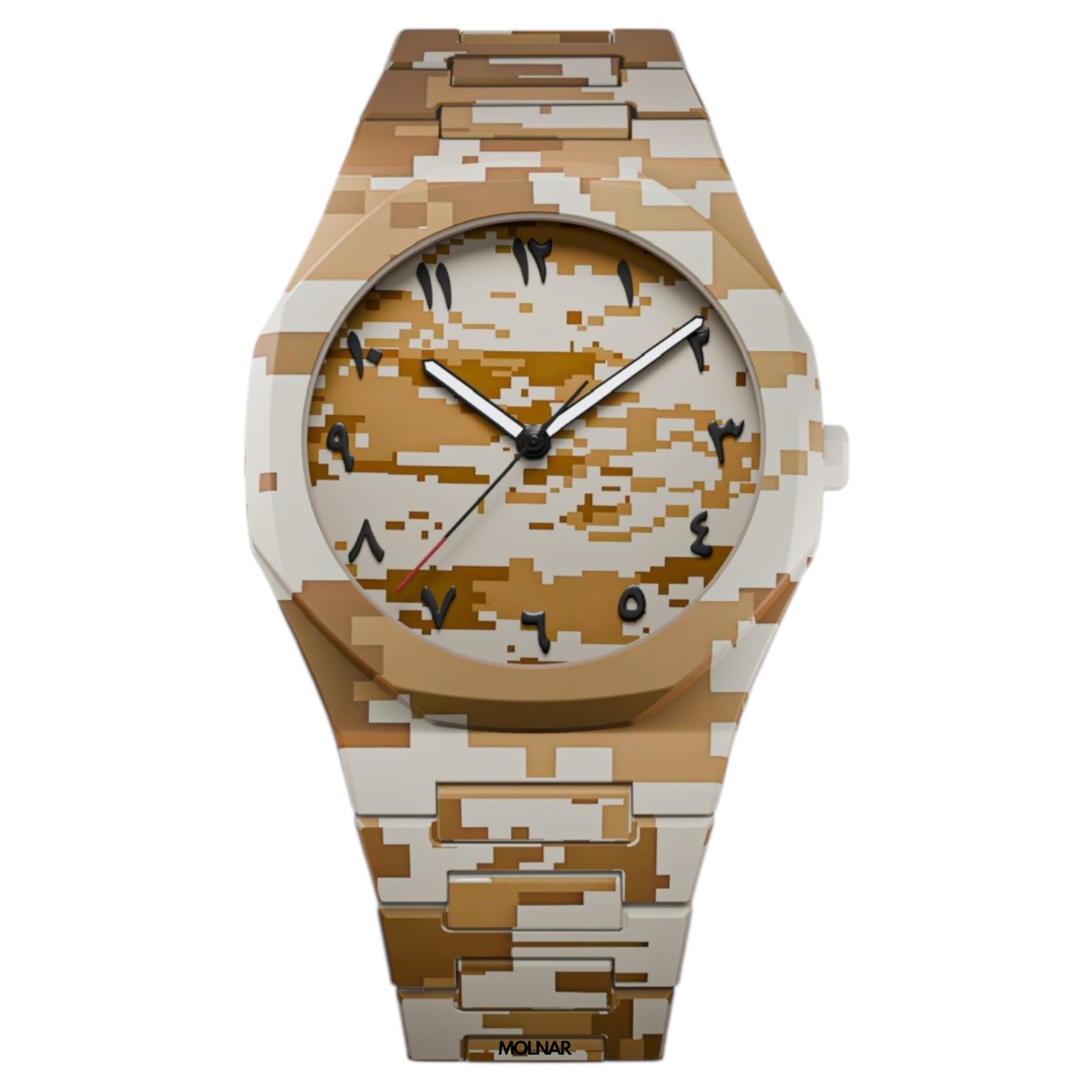 A bold fusion of pixel-inspired design and desert tones, the Molnar Sahara stands out with its blocky aesthetic and warm, earthy color palette. Sand gold, burnt orange, and deep black come together in a timepiece that evokes the raw beauty of arid landscapes. Rugged yet stylish, this watch is made for those who thrive in adventure and appreciate unique, eye-catching design.